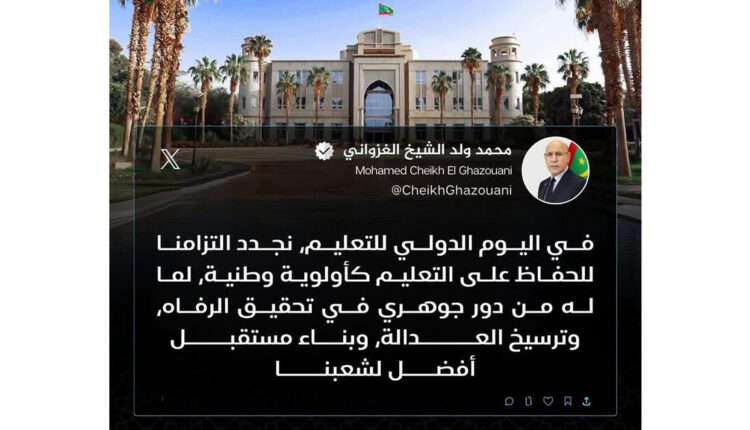 جدد فخامة رئيس الجمهورية، السيد محمد ولد الشيخ الغزواني، في تغريدة له اليوم السبت على منصة (X)، التزامه بالحفاظ على التعليم كأولوية وطنية.