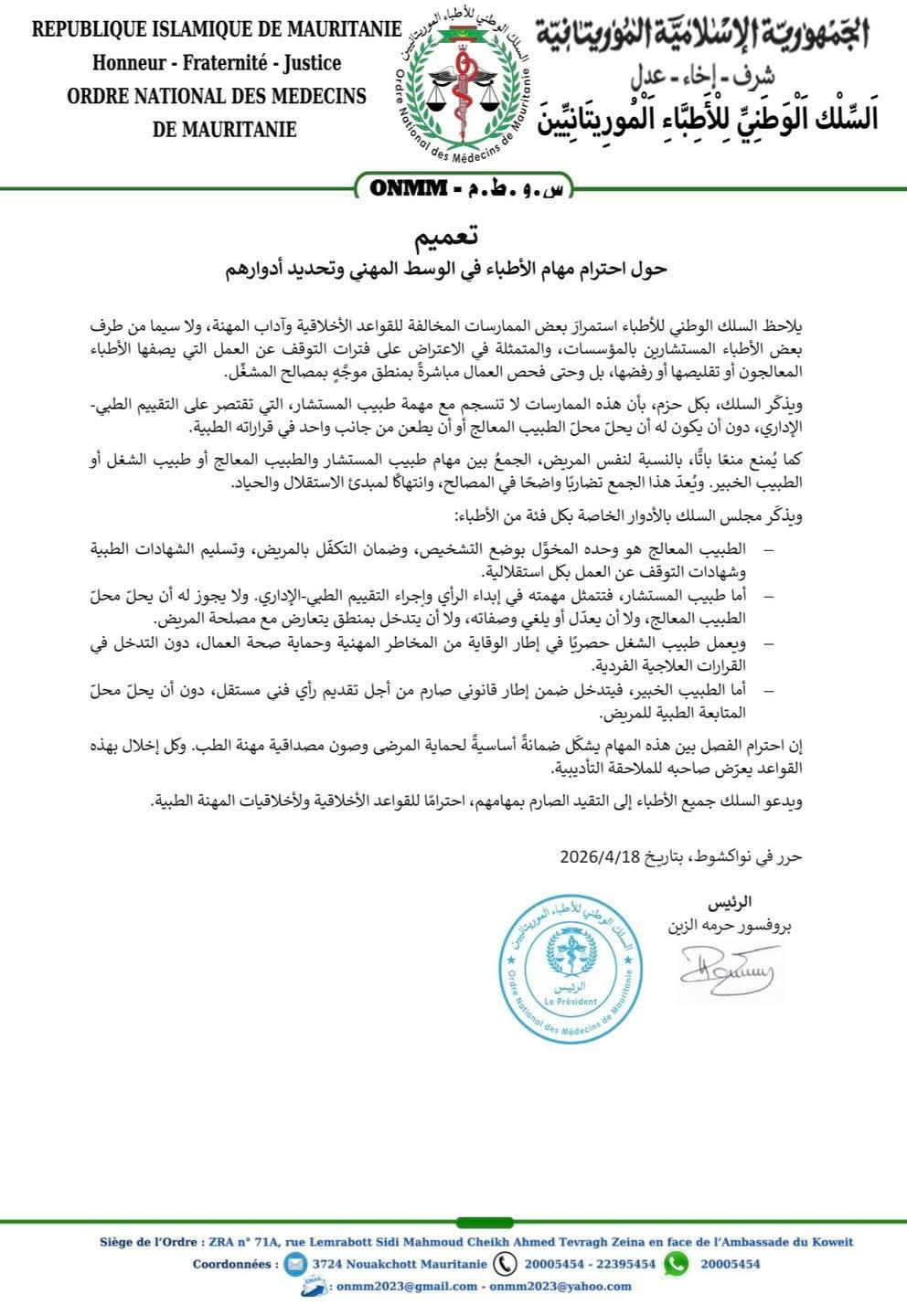 دعا السلك الوطني للأطباء في نواكشوط إلى ضرورة الالتزام الصارم باختصاصات ومهام كل فئة من الأطباء، مؤكداً أهمية احترام الضوابط المهنية داخل الوسط الصحي. وحذر السلك من استمرار بعض الممارسات التي وصفها بالمخالفة للقواعد الأخلاقية وآداب المهنة.