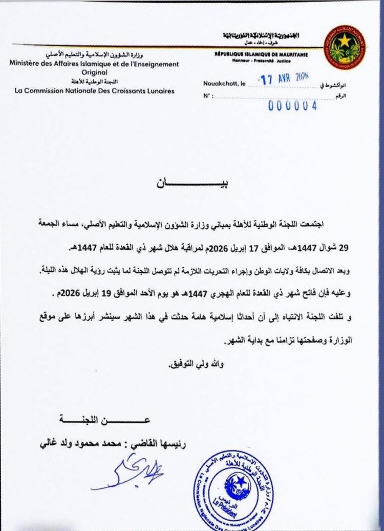 وأوضحت اللجنة، في بيان صادر اليوم بنواكشوط، أنها أجرت الاتصالات والتحريات اللازمة على عموم التراب الوطني، دون أن تتوصل إلى ما يثبت رؤية الهلال.