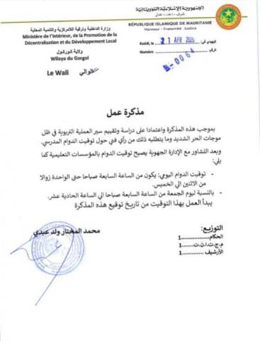 تقرر بموجب مذكرة عمل وقعها والي كوركول محمد المختار ولد عبدي اليوم الثلاثاء تغيير ساعات الدوام المدرسي بعموم الولاية.