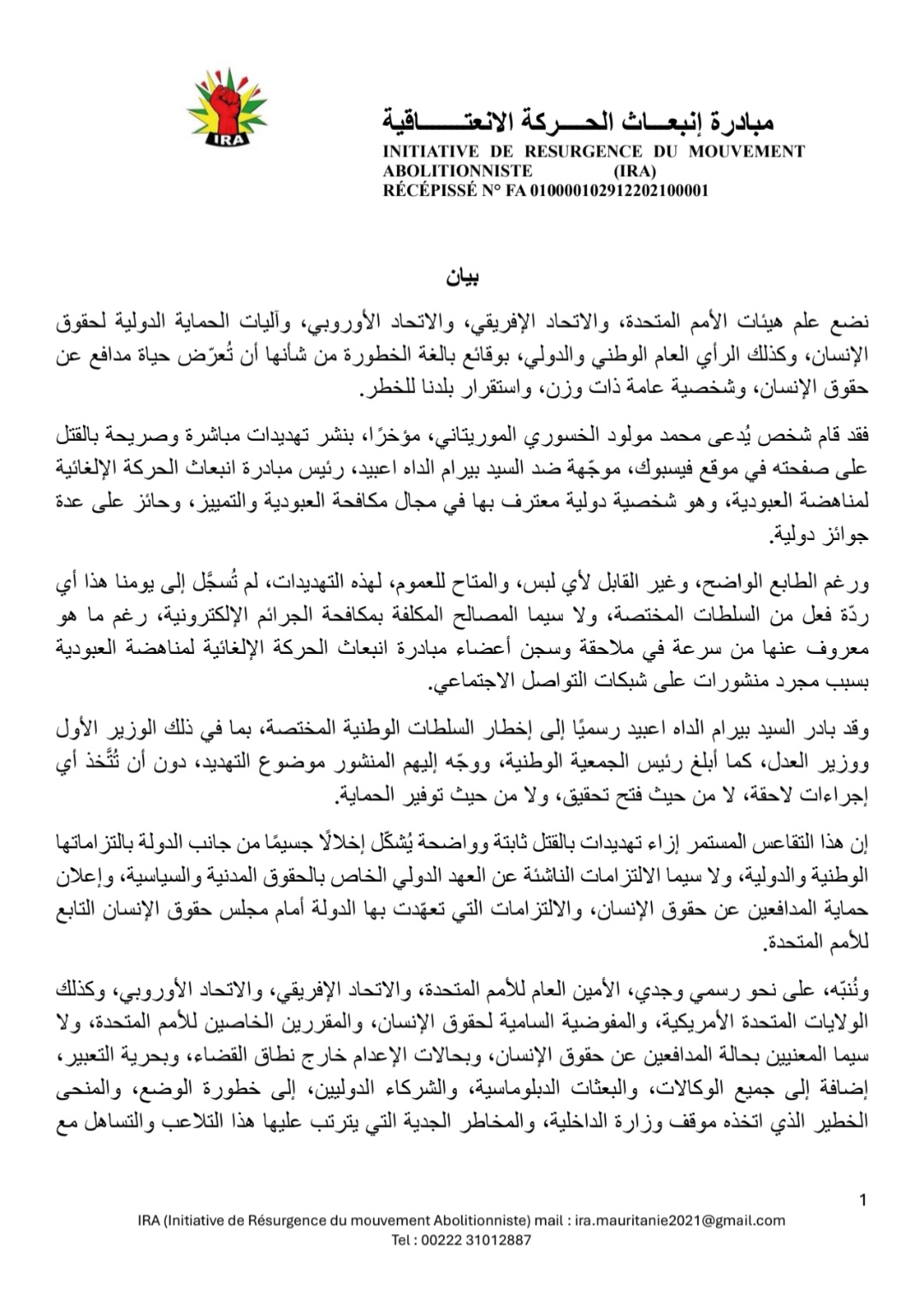 قالت حركة "إيرا" إن رئيسها بيرام الداه اعبيد تعرض للتهديد بالقتل من أحد النشطاء على الفيسبوك، لكن السلطات الموريتانية "لم تحرك ساكنا".