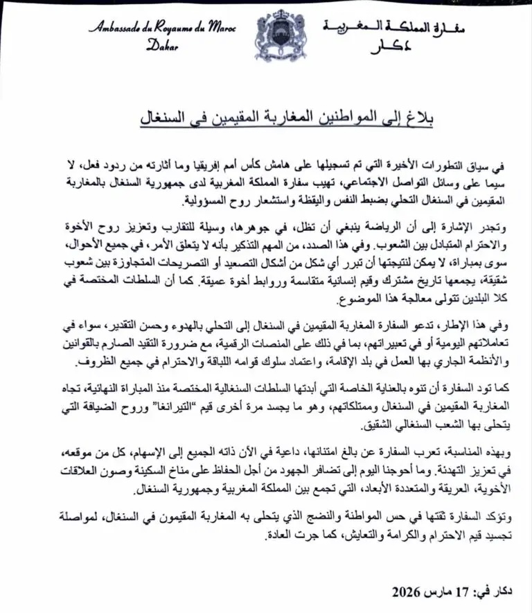 دعت السفارة المغربية في دكار مواطنيها المقيمين في السنغال إلى التحلي بضبط النفس واليقظة، واستشعار روح المسؤولية، وذلك على خلفية مستجدات مرتبطة بمنافسات كأس الأمم الإفريقية.